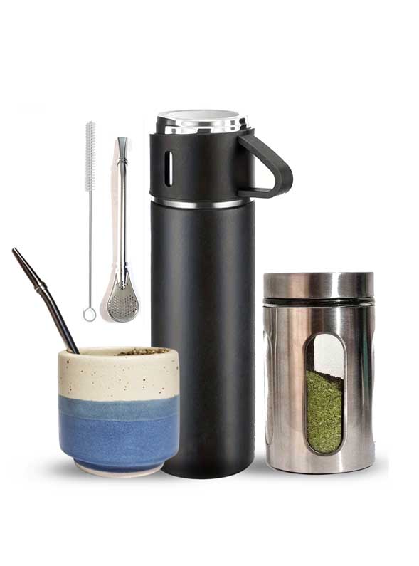 Kit mate de cerámica con mate de cerámica grueso, termo para mate de acero inoxidable, bombilla acero inoxidable, yerba mate rosamonte. La compra Incluye un cepillo limpiador de bombillas de obsequio.